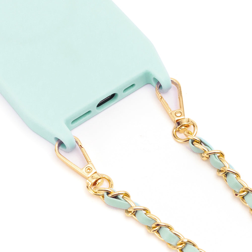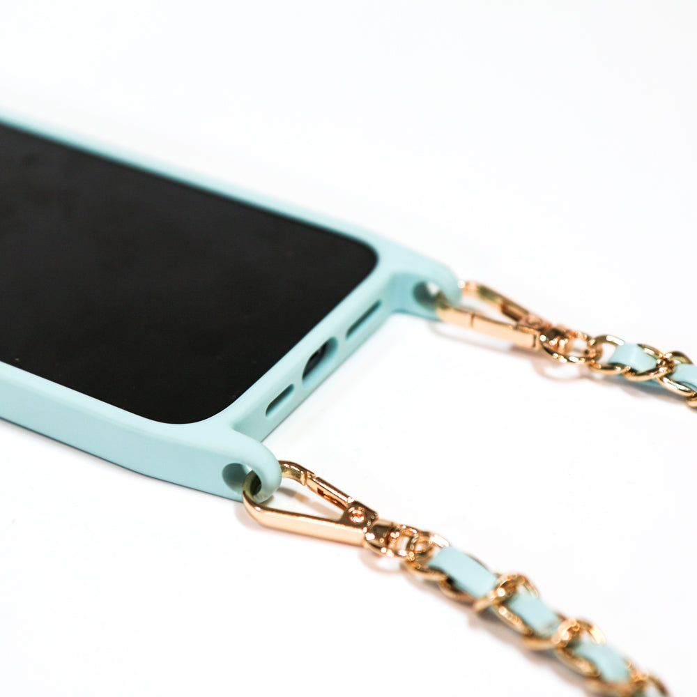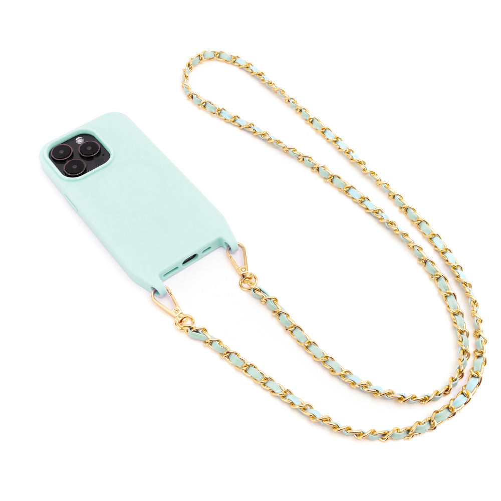 Keep your phone safe and always within reach with this lightweight case. This minimalistic case not only protects your phone, but allows you to go hands-free. The elegant gold tone chain and color coordinating vegan leather strap makes this a stylish accessory for your phone. The interior is lined with soft microfiber that helps prevent scratches on the delicate surface of your phone. The crossbody strap easily clips on and off giving you the flexibility of using it as a standalone or crossbody case. This case is MagSafe compatible that allows you to simply snap on your MagSafe charger and accessories.