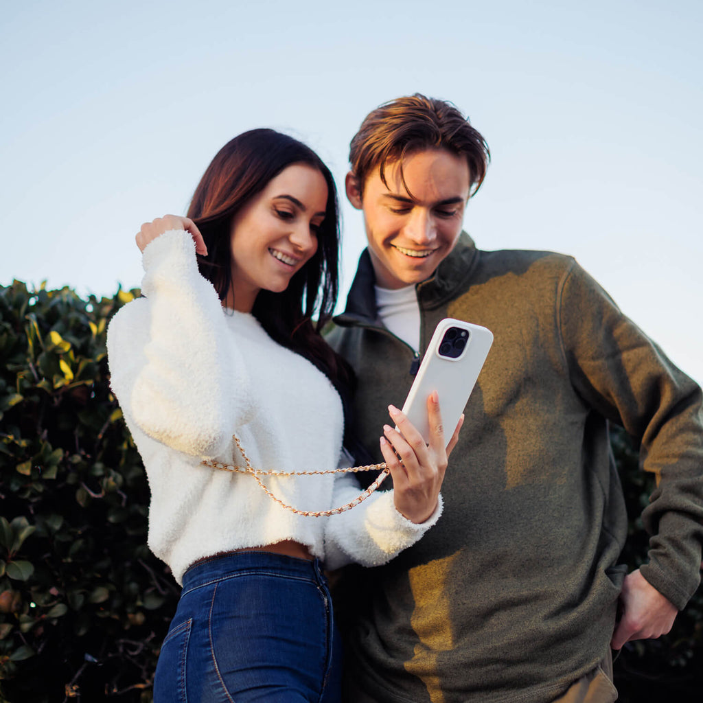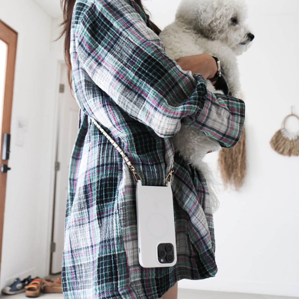 Keep your phone safe and always within reach with this lightweight case. This minimalistic case not only protects your phone, but allows you to go hands-free. The elegant gold tone chain and color coordinating vegan leather strap makes this a stylish accessory for your phone. The interior is lined with soft microfiber that helps prevent scratches on the delicate surface of your phone. The crossbody strap easily clips on and off giving you the flexibility of using it as a standalone or crossbody case. This case is MagSafe compatible that allows you to simply snap on your MagSafe charger and accessories.