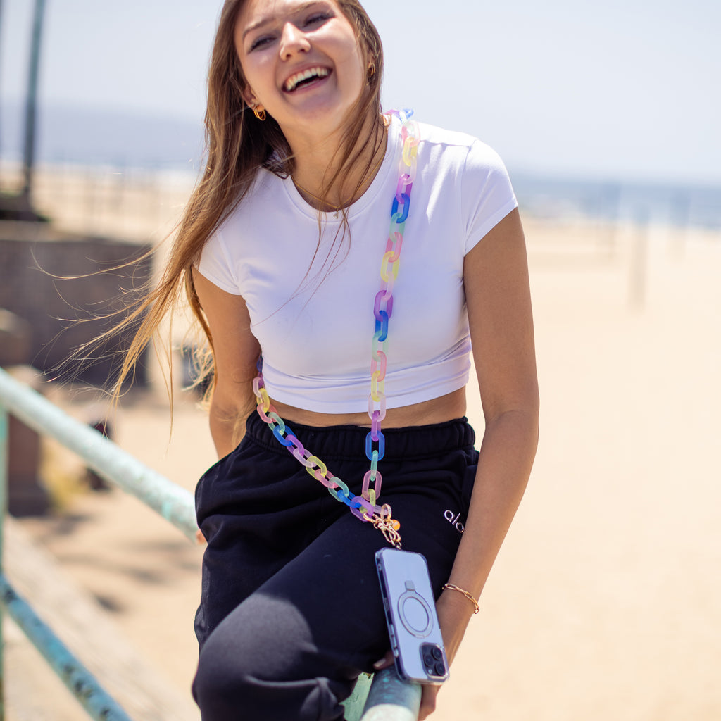 Take your everyday look to the next level with our collection of phone chains and straps. The perfect combination of style and functionality, allowing you to reinvent your look at anytime. The Kendall Strap, a vibrant and stylish accessory that brings a burst of color to your phone. Featuring frosted rainbow chain links, this strap is designed to stand out and make a statement while offering the convenience of hands-free carrying.